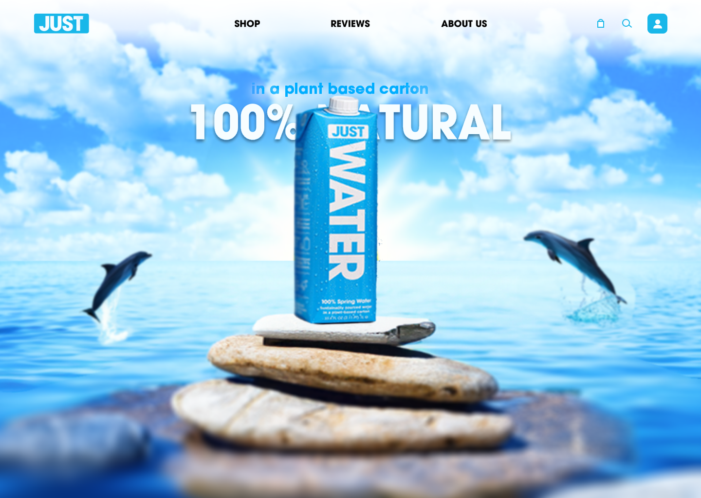 An animated homepage design for JUST WATER, a minority owned and 100% recyclable water company with plant based cartons